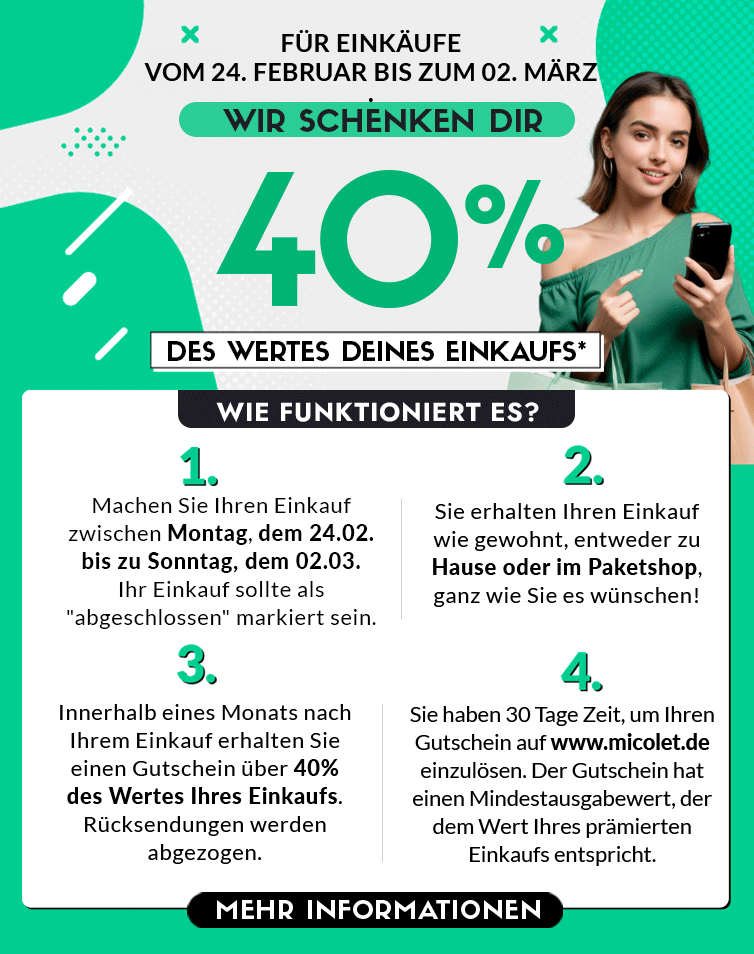 Vom 24. Februar bis zum 2. März möchten wir dir für dein Vertrauen und deine Treue danken, indem wir dir 40% der Einkäufe, die du auf www.micolet.de tätigst, schenken. Für jeden Kauf, den du in dieser Woche tätigst, erstellen wir einen personalisierten Rabattcode im Wert von 40% deines Auftrags. Das bedeutet, die Anzahl der Gutscheine pro Nutzer ist nicht begrenzt, sondern jede Bestellung, die du in dieser Woche aufgibst, wird mit einem entsprechenden Preis belohnt.